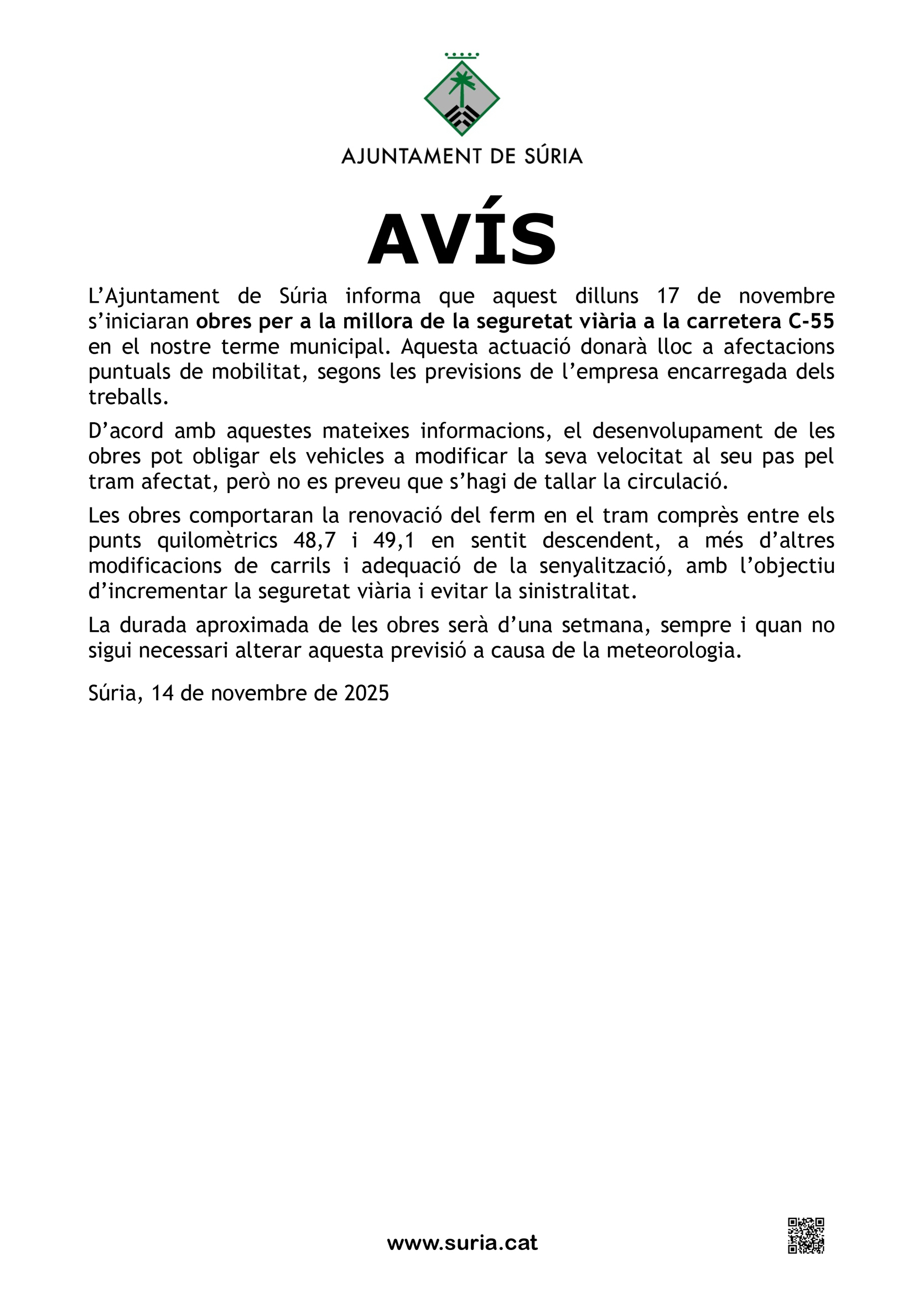 L’Ajuntament de Súria informa que aquest dilluns 17 de novembre s’iniciaran obres per a la millora de la seguretat viària a la carretera C-55 en el nostre terme municipal. Aquesta actuació donarà lloc a afectacions puntuals de mobilitat, segons les previsions de l’empresa encarregada dels treballs.
