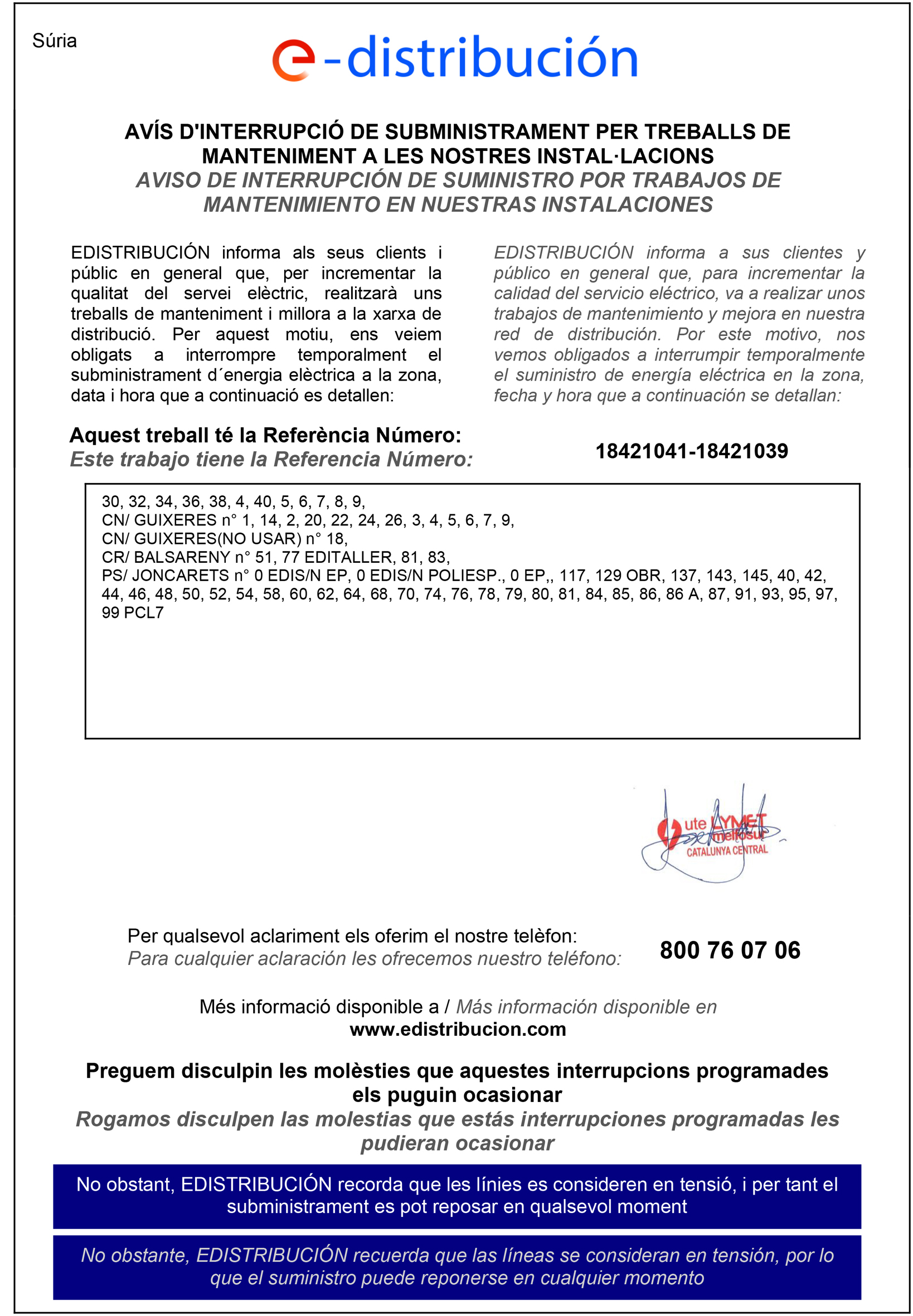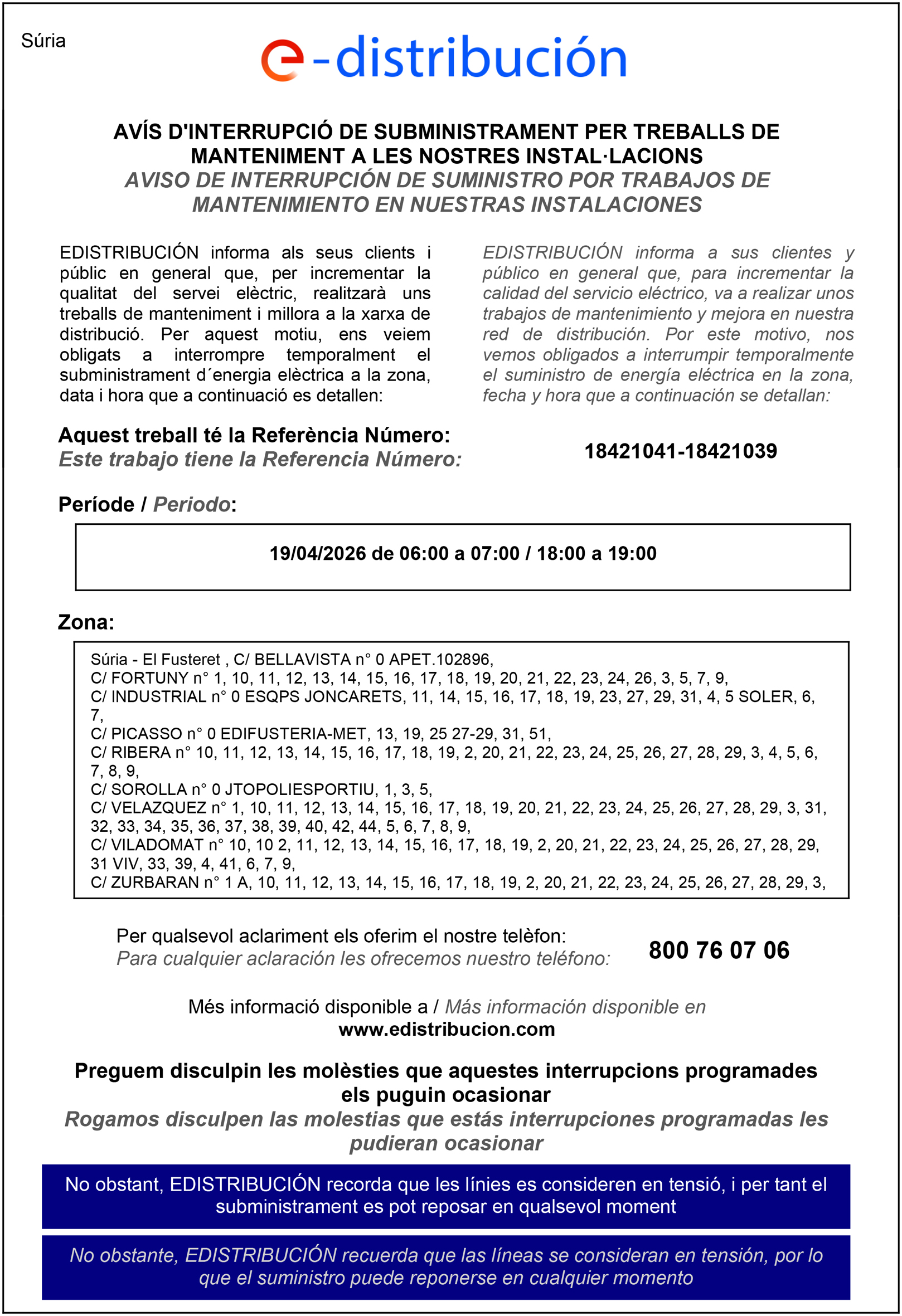 Avís sobre tall de subministrament elèctric per al diumenge 19 d'abril