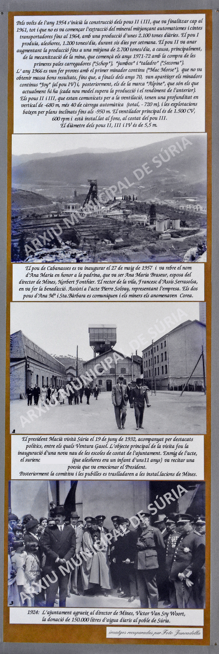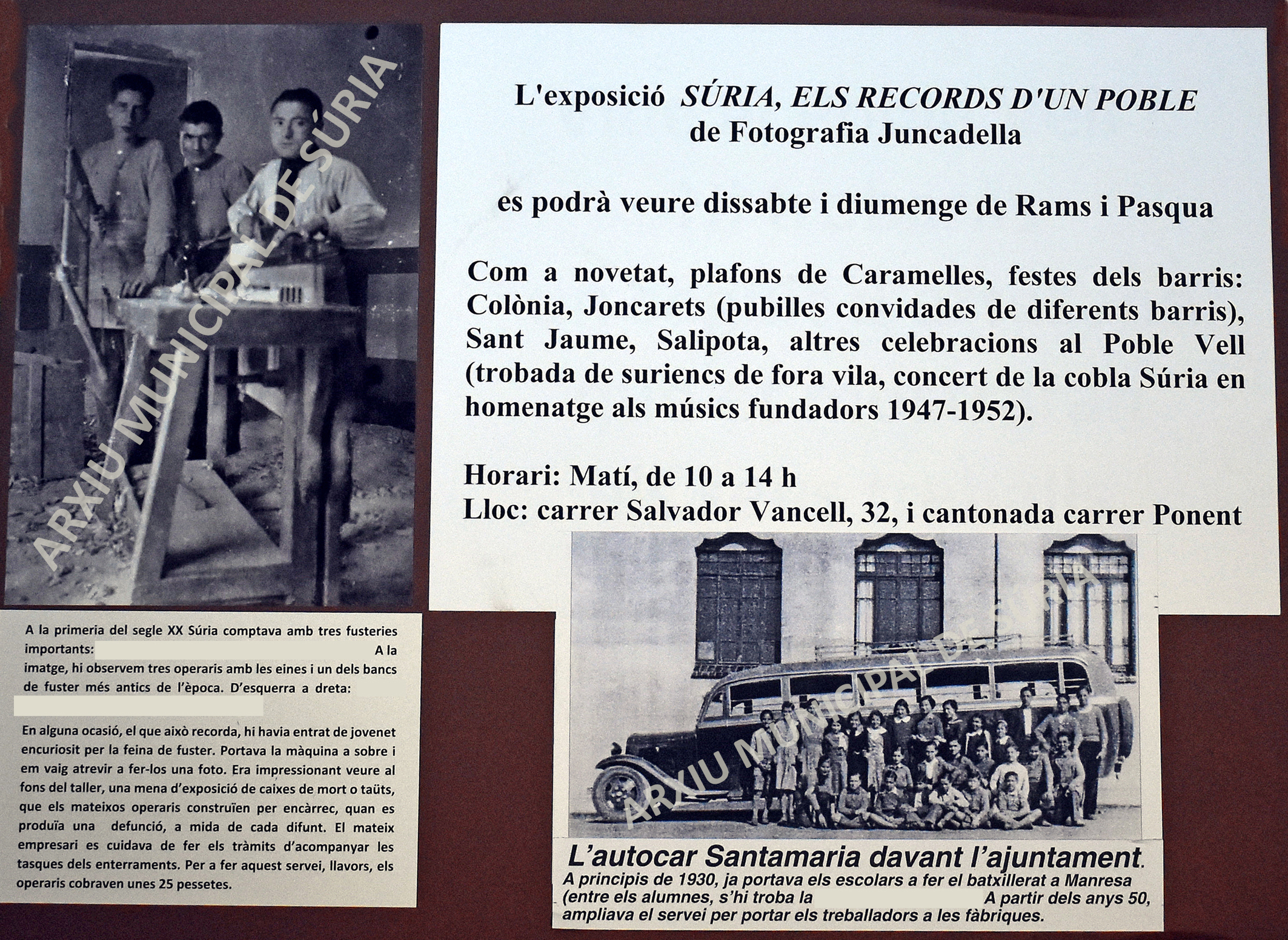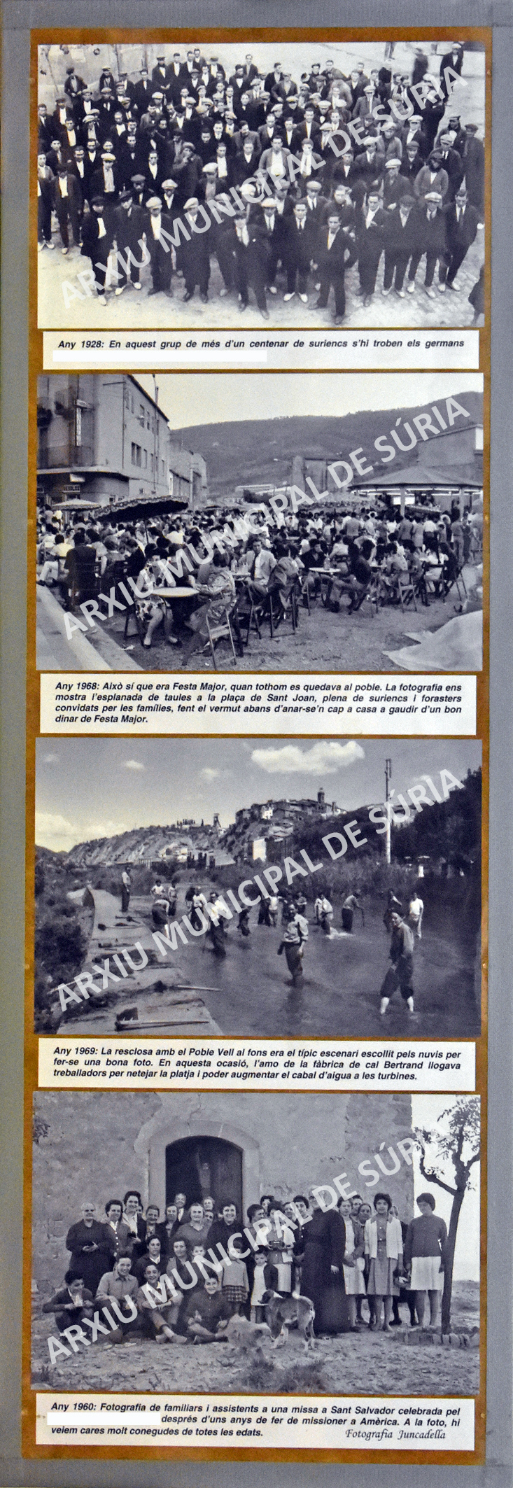 Els plafons de Fotografia Juncadella formen part del fons Fotografia Juncadella de l’Arxiu Municipal de Súria. En total, són més de 260 plafons amb centenars de fotografies històriques de Súria des de finals de segle XIX fins a començaments del segle XXI, acompanyades d’amplis peus de foto explicatius sobre els temes i els personatges retratats.