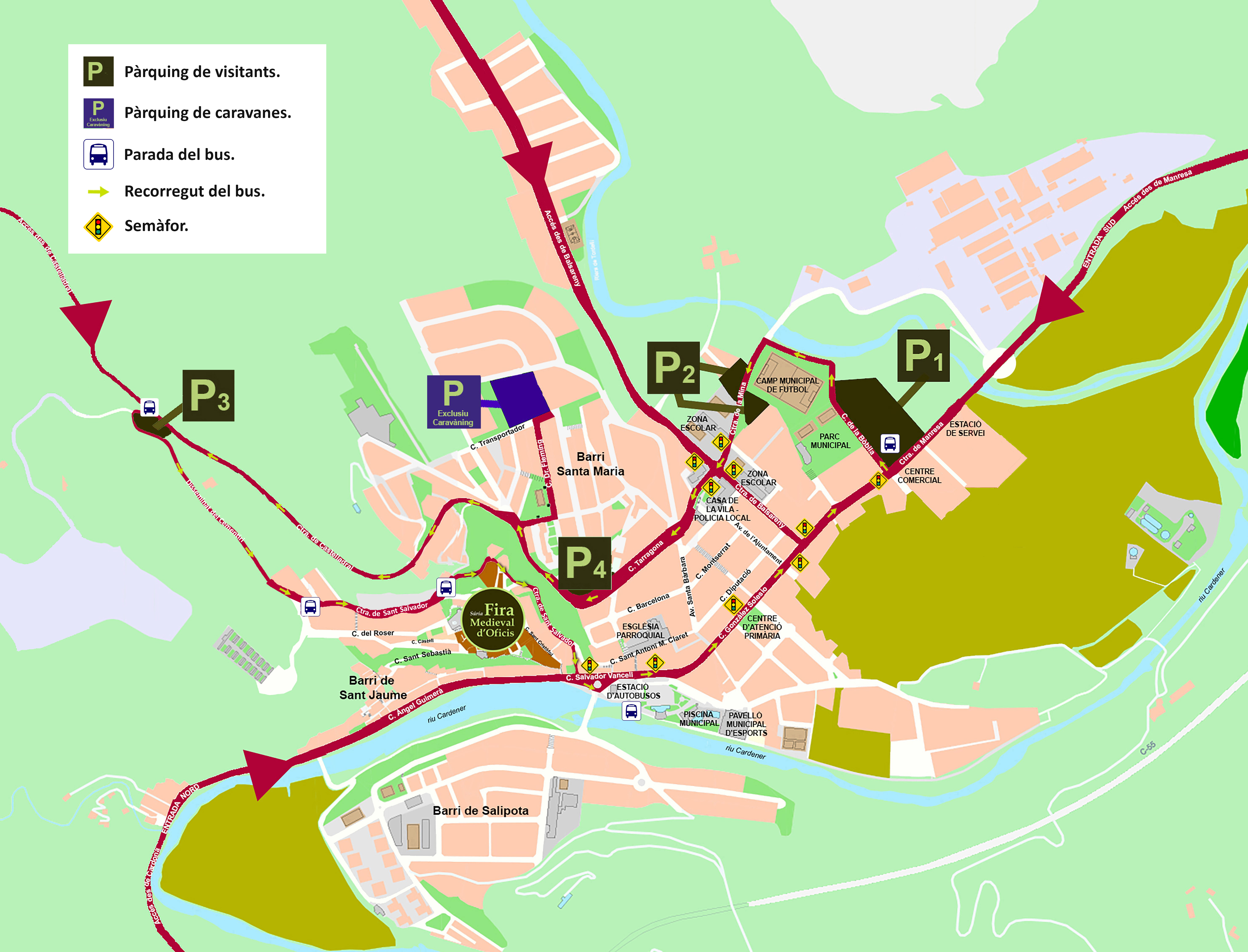 - Recorregut circular: Pàrquing 1, carretera de la Mina, carrer Tarragona, carretera de Castelladral, accés nord al Poble Vell, carretera de Sant Salvador, plaça Clavé, Estació d'Autobusos, centre urbà, carretera de Manresa i Pàrquing 1.