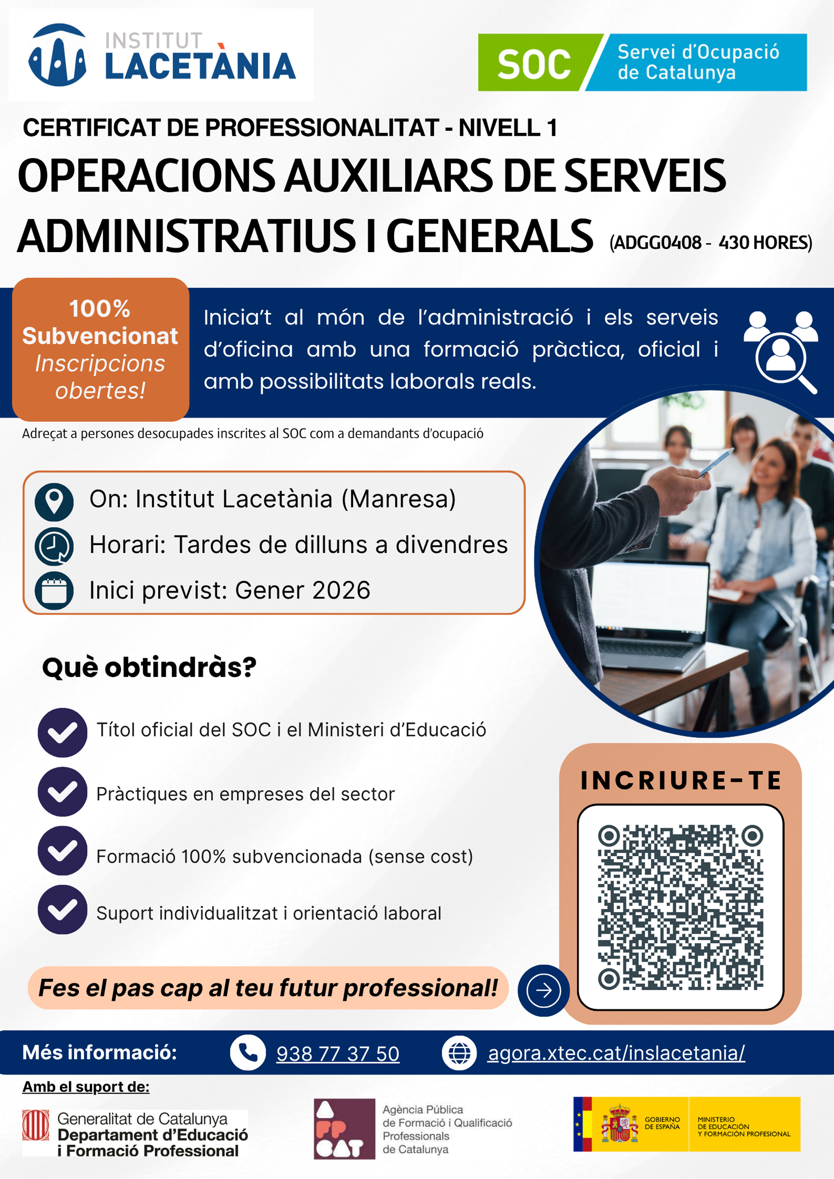 - Objectiu: iniciació en el món de l’administració i els serveis d’oficina amb una formació pràctica, oficial i amb possibilitats laborals reals.