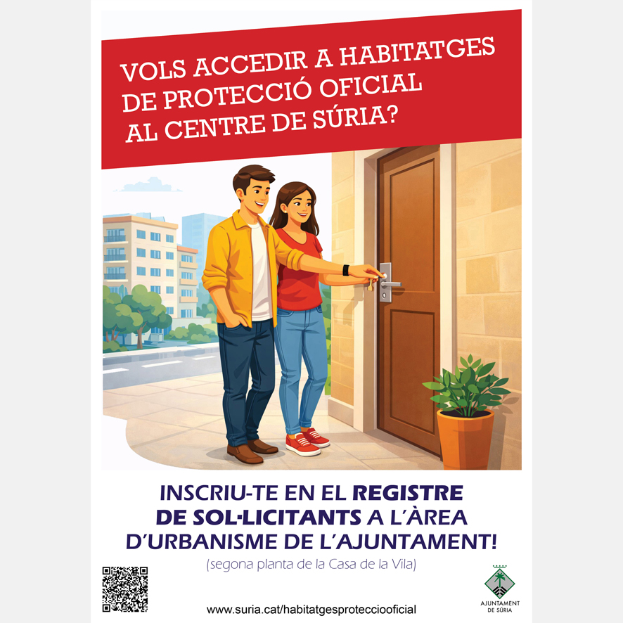 L’Ajuntament de Súria està adherit al Registre de sol·licitants d’Habitatges de Protecció Oficial (HPO), on s’han d’inscriure totes les persones que vulguin optar a un habitatge de protecció oficial, ja sigui de venda, de lloguer o de lloguer amb opció de compra.