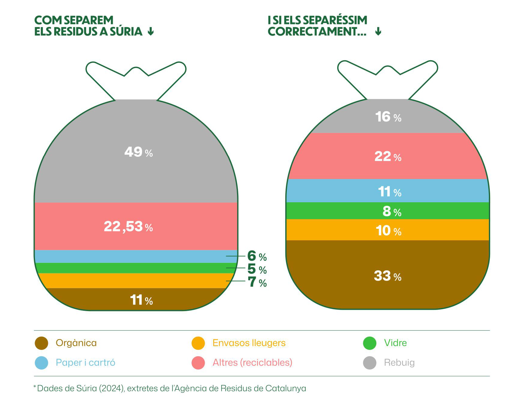 La gestió dels residus és un dels reptes més importants que tenim com a comunitat. Actualment, la recollida selectiva al nostre municipi se situa en un 51%; ara bé, tot i que aquest percentatge suposa un esforç compartit, encara queda camí per recórrer per assolir els objectius europeus i garantir una gestió més sostenible dels residus.