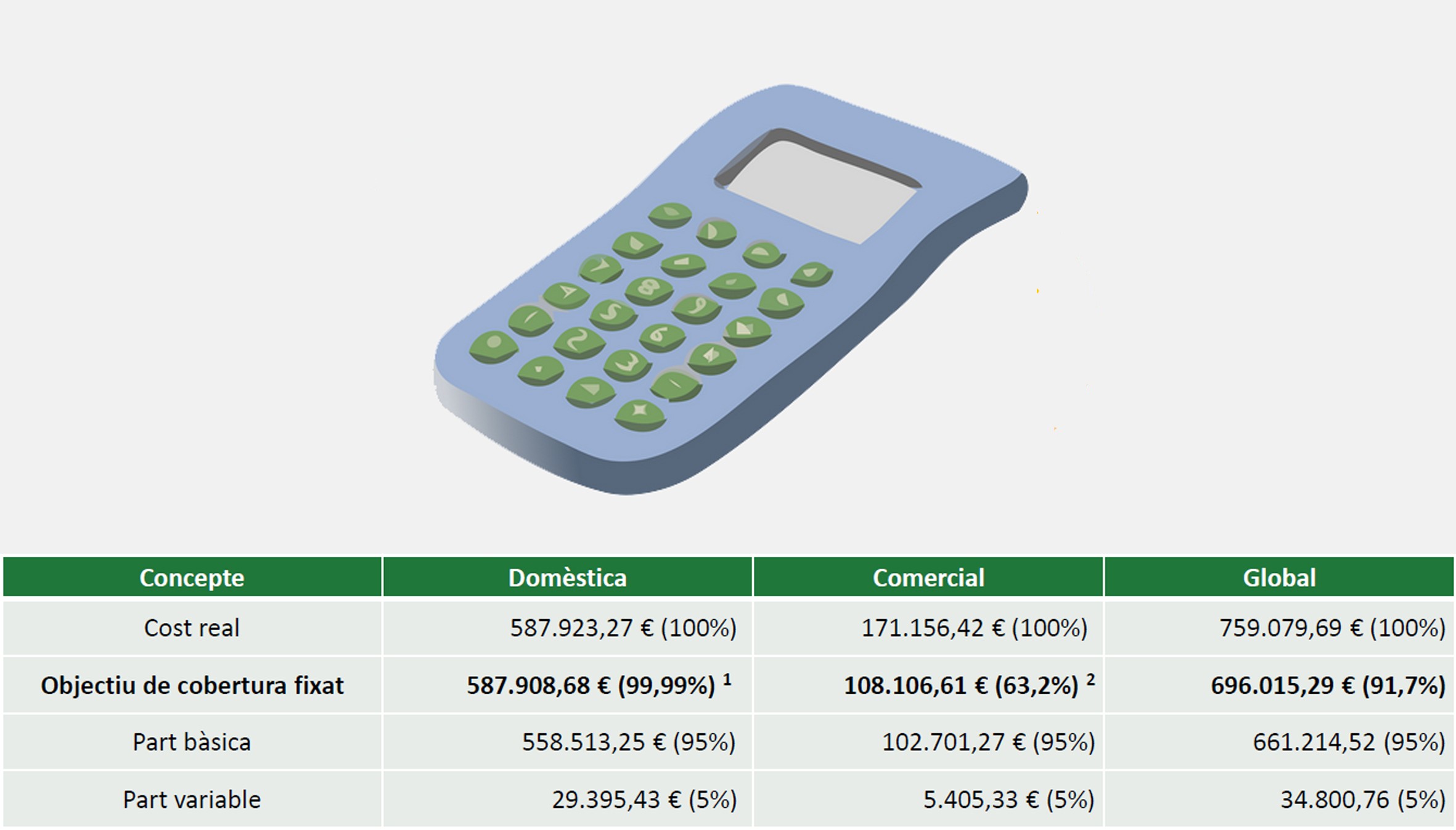 2. Per evitar un increment molt alt de les quotes comercials, es fixa un objectiu de cobertura de costos del 63,2%. Això permet que la recaptació per taxa comercial representi el 15,53% de la recaptació.