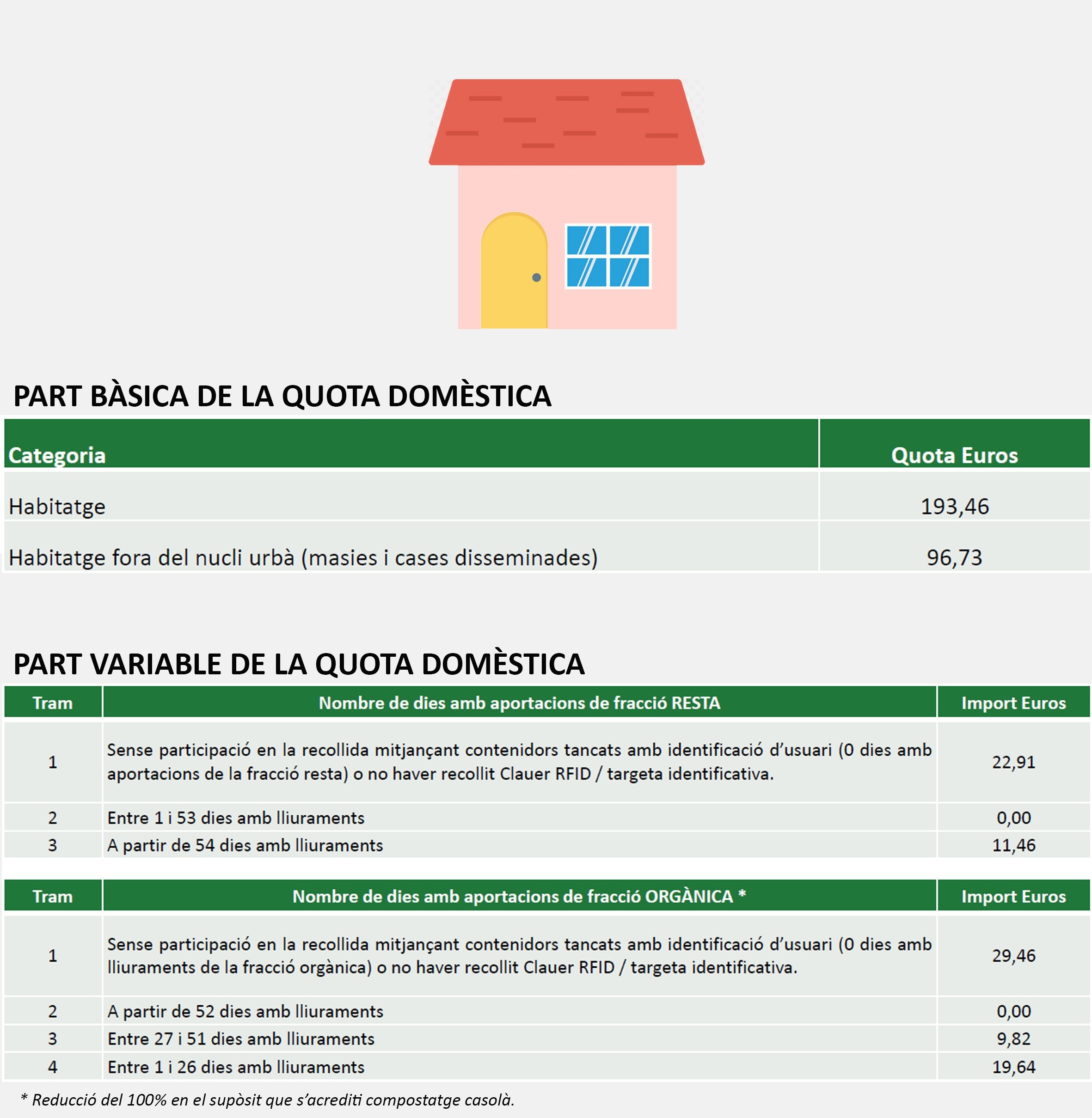 - Acreditació de compostatge casolà. Reducció del 100% de la part variable de la quota, vinculada a la fracció orgànica.